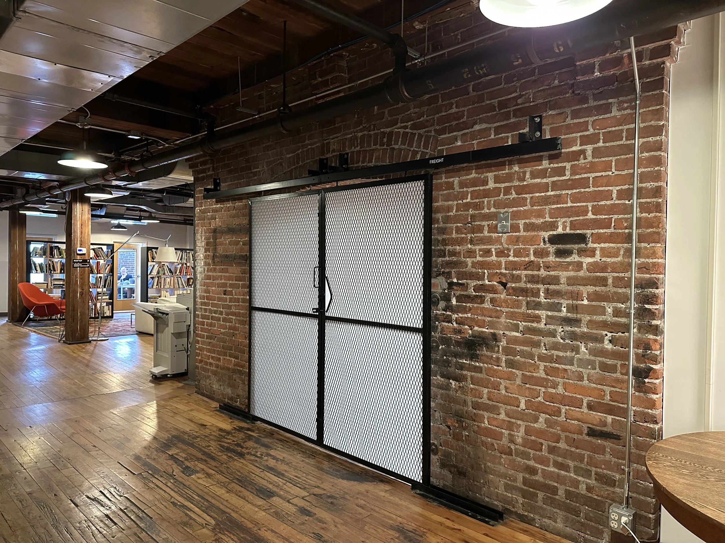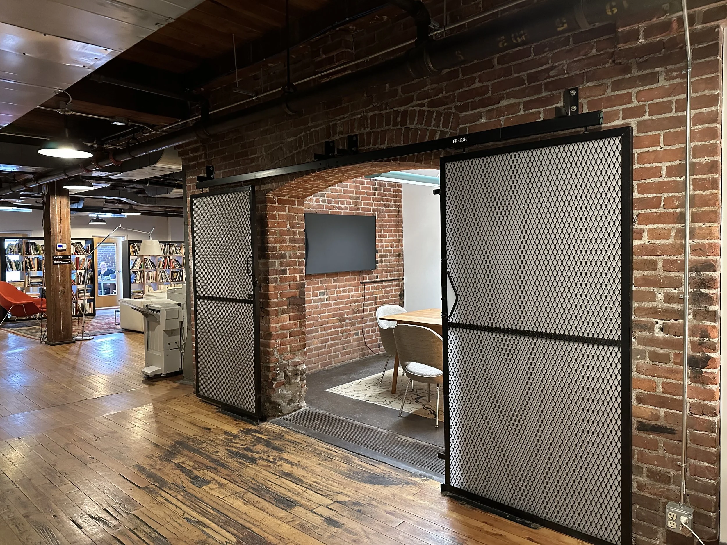 Interior of a modern space with a brick wall, wooden floor, bookshelves, armchair, and a sliding metal door labeled 'FREIGHT'.