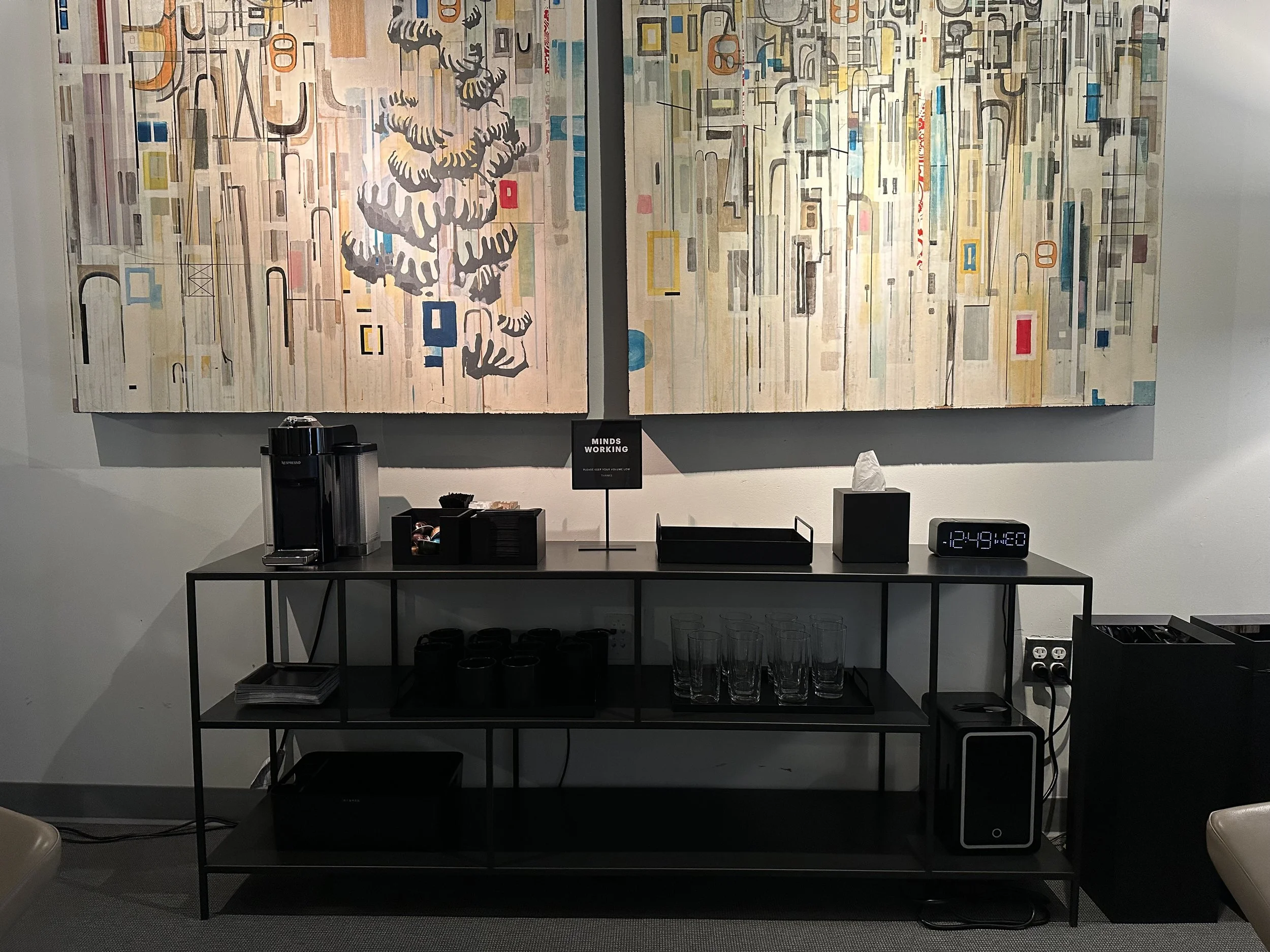 A black metal shelf with a coffee station on top, including a coffee machine, cups, and a tissue box. Behind the shelf are two abstract paintings with geometric shapes and lines. To the right of the shelf is a digital clock displaying 12:48. There ar
