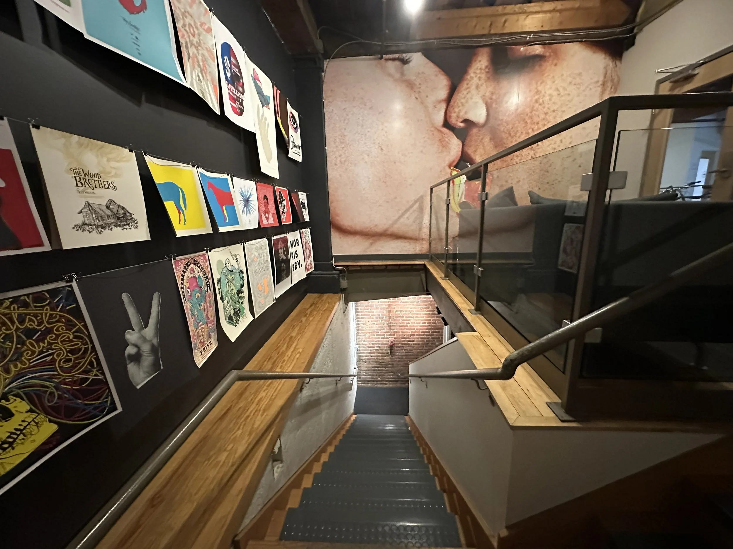 View of a staircase with artwork on the wall and a large mural of a kissing couple in the background.