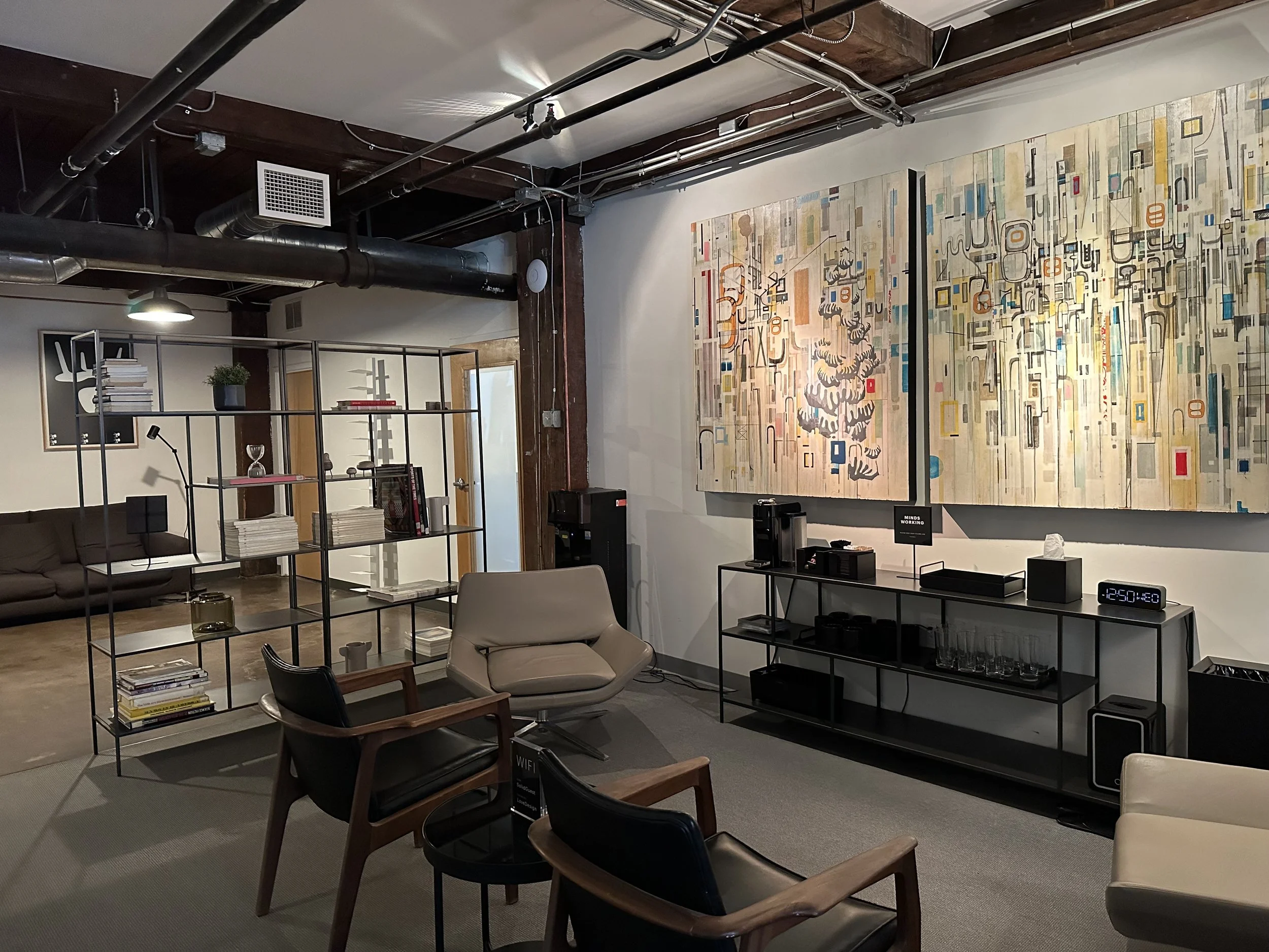 Modern office or lounge area with artwork, a bookshelf, chairs, and a coffee station.