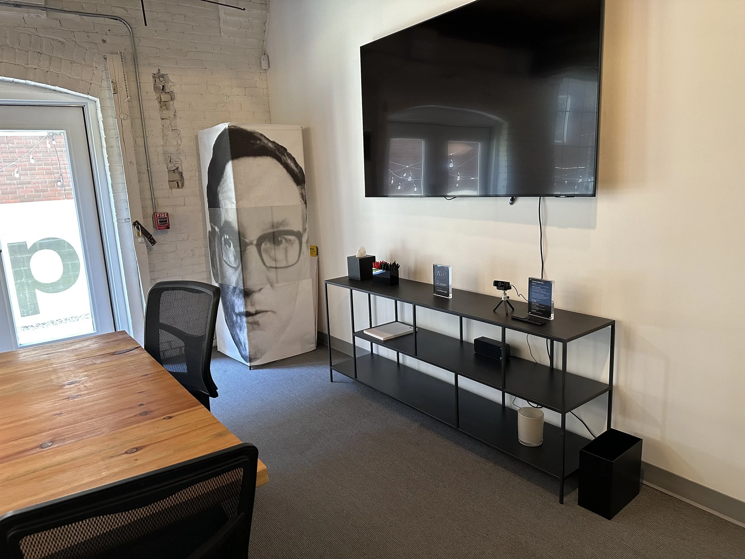 Modern conference room with a large wooden table, black office chairs, and a flat-screen TV mounted on the white brick wall. Large windows let in natural light, and there are two hanging pendant lights above the table. An artwork of a person's face a