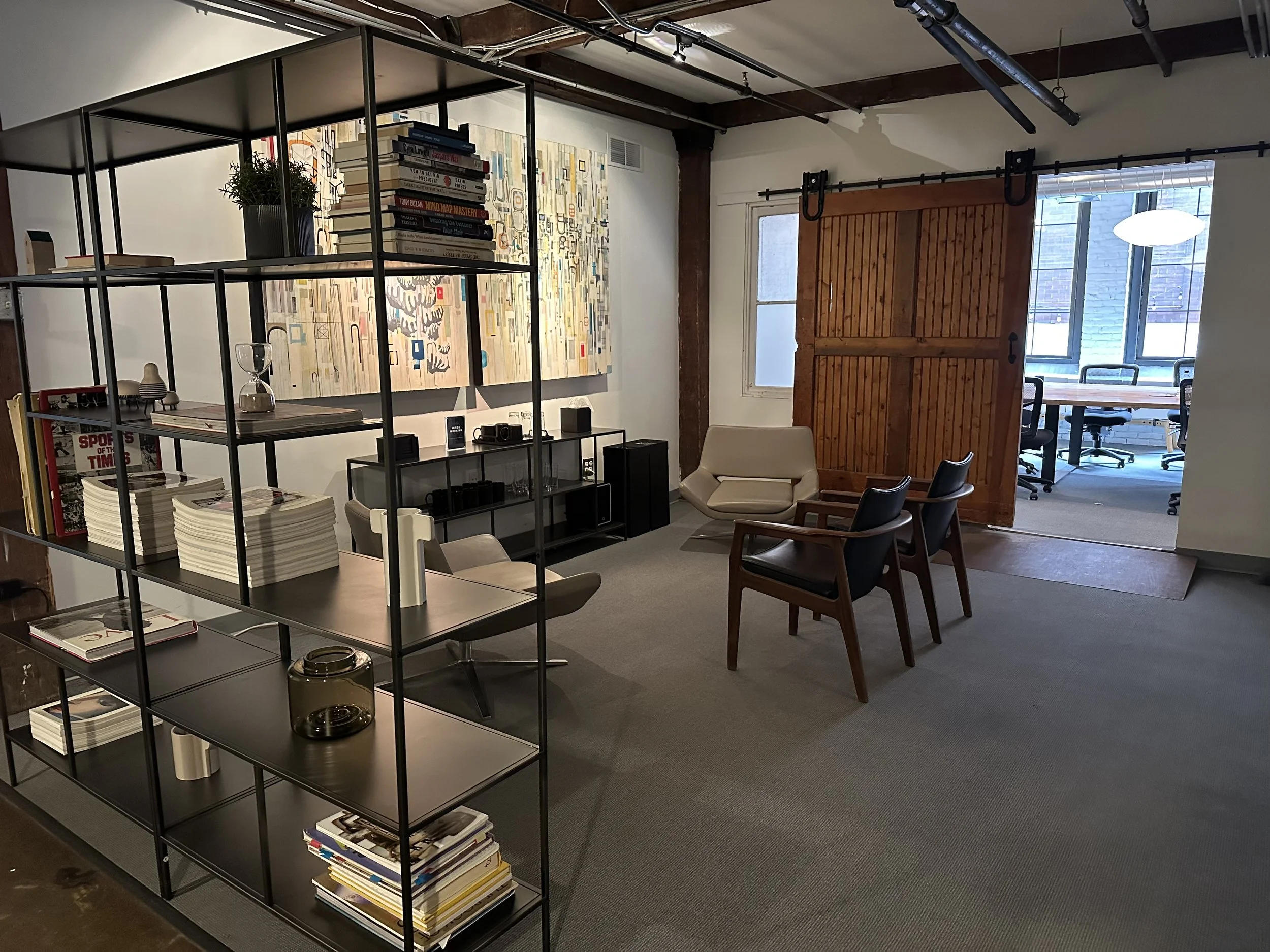 A modern office lounge area with a steel bookshelf filled with books, magazines, decorative items, and an hourglass in the foreground. There are two upholstered chairs and two wooden armchairs in front of a large wooden sliding barn door. An office c