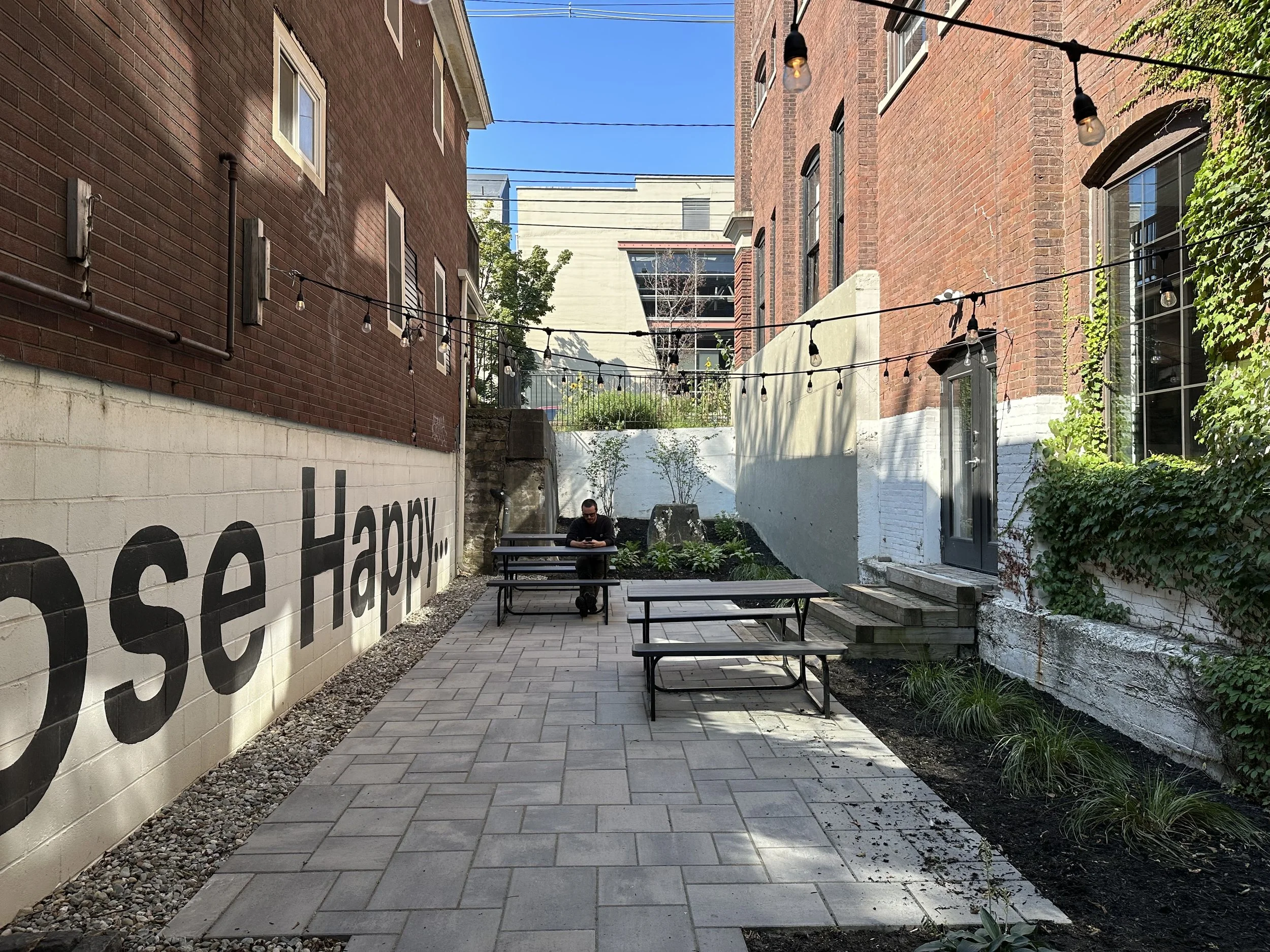 An outdoor urban patio with three picnic tables, string lights overhead, a person sitting at a table, and a painted wall with the words 'ose Happy...' on the left side.